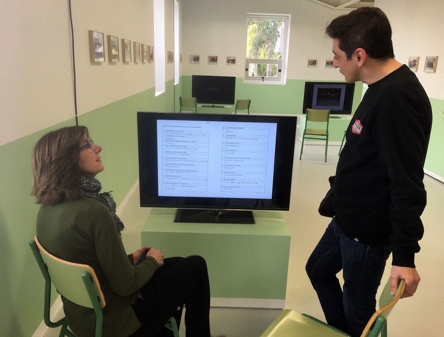 Marta López-Briones y Mira Bernabéu frente a una de las pantallas de la serie 'Panorama activo' (2015-18)