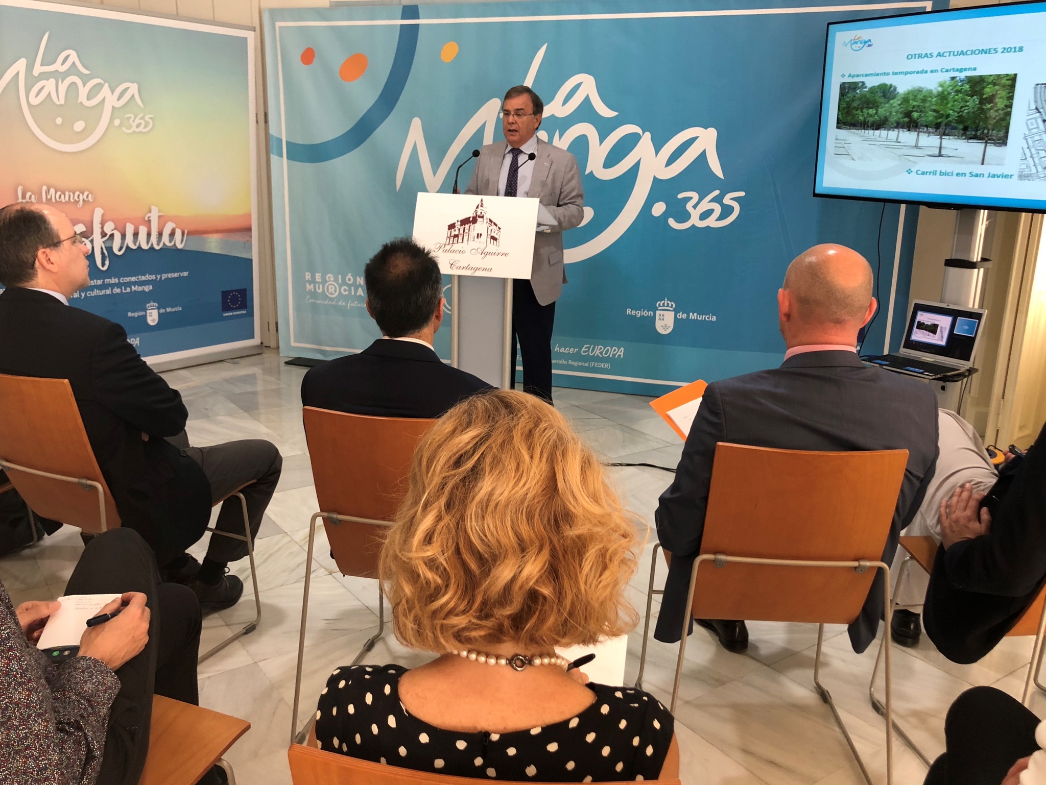 El consejero Patricio Valverde durante la presentación del concurso de ideas para crear un nuevo mirador en la Gola de Marchamalo con vistas al Mar Mediterráneo en La Manga del Mar Menor.