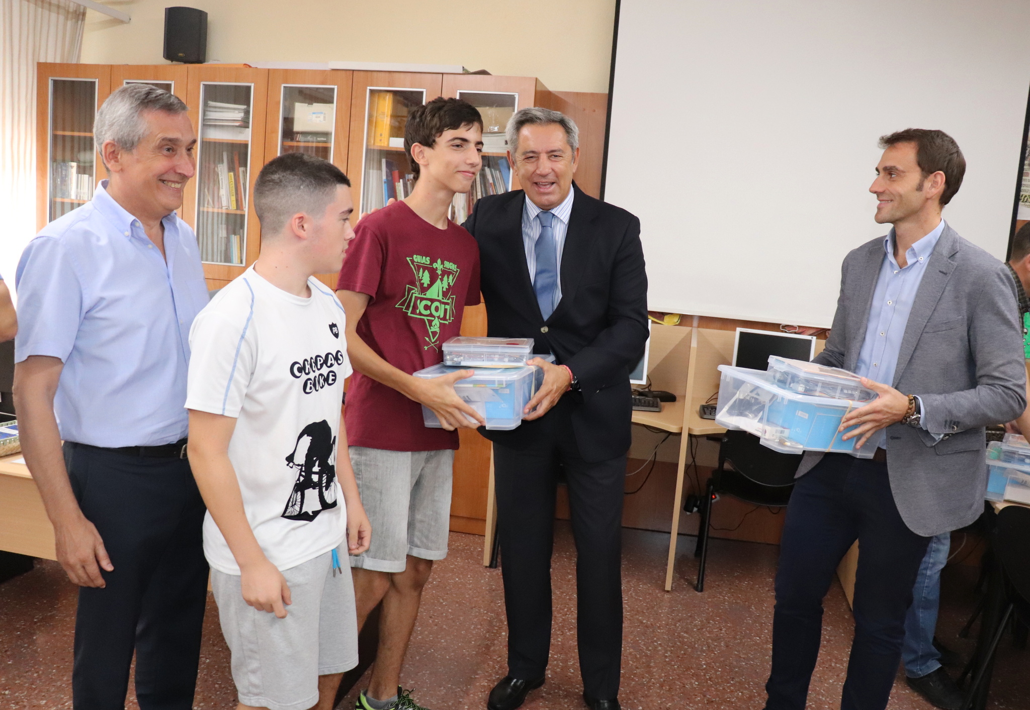 El consejero de Hacienda, Fernando de la Cierva, entrega los kits de robótica a los alumnos del IES Ramón y Cajal, que este curso se une al programa de robótica educativa 'El cable amarillo' (II)