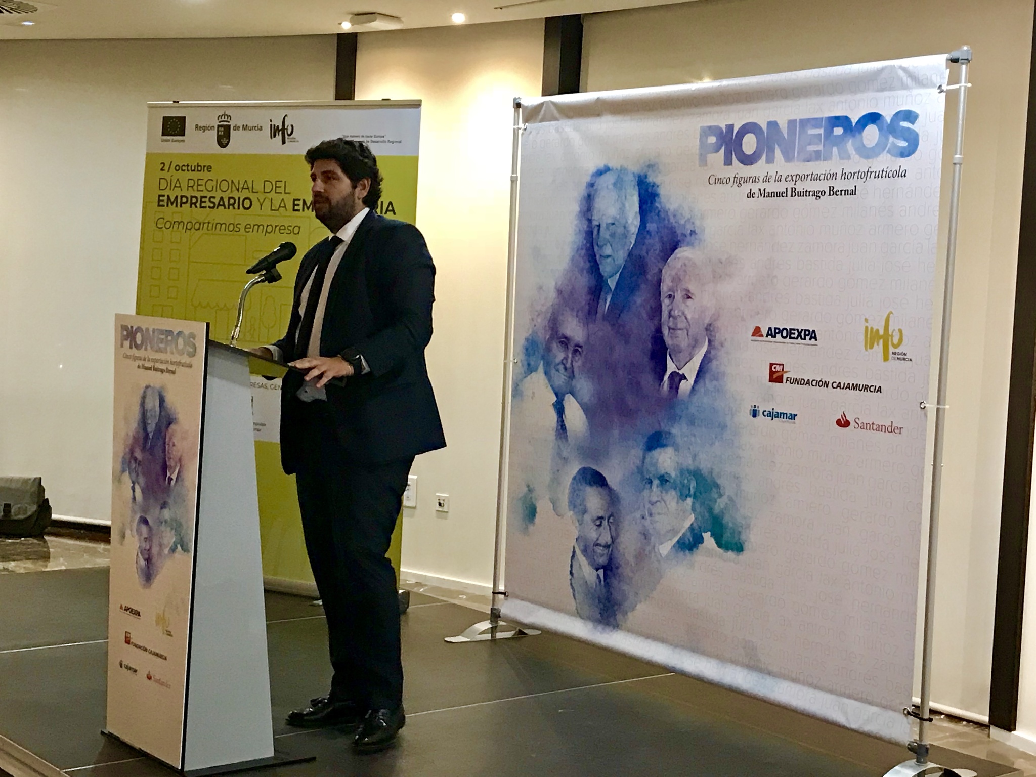 El jefe del Ejecutivo regional, Fernando López Miras, presidió hoy la presentación del libro ‘Pioneros’, del periodista Manuel Buitrago, en el que se reconoce a cinco figuras emblemáticas del mundo de la empresa murciana, “pioneros de nuestro sector hortofrutícola, que tanto han contribuido a hacer de los productos de la Región sinónimo de calidad y excelencia”, remarcó el presidente.