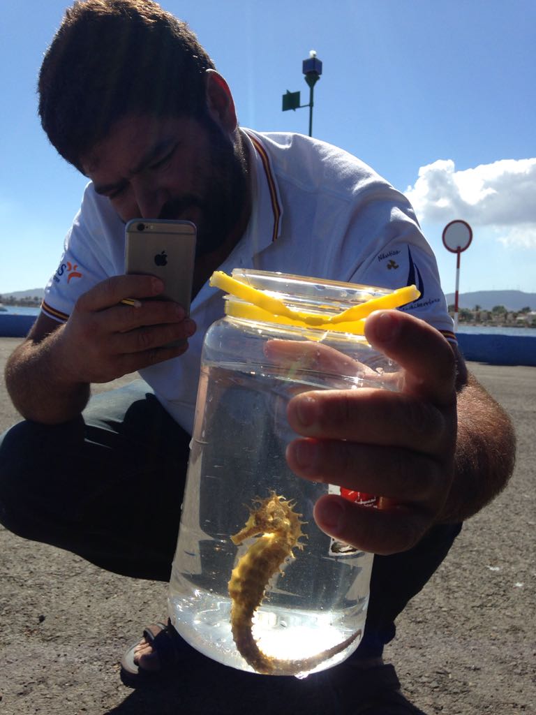 Uno de los caballitos de mar liberados durante las labores de retirada de las redes anti medusas del Mar Menor.