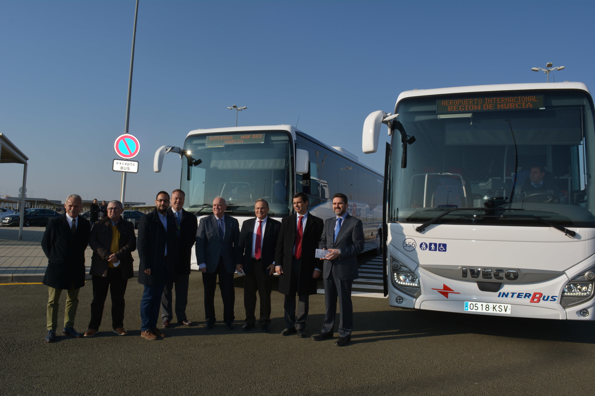 El consejero de Fomento e Infraestructuras, Patricio Valverde, informó hoy de los servicios de autobús que conecta el aeropuerto con Murcia, Cartagena y los municipios del Mar Menor. En la imagen, el consejero está acompañado por el director general de Transportes, José Ramón Díez de Revenga, los concejales representantes de los municipios de Murcia, Cartagena, Los Alcázares y San Pedro y el director general de la empresa prestataria de los servicios de autobús ‘Interbus’, Antonio Martínez.