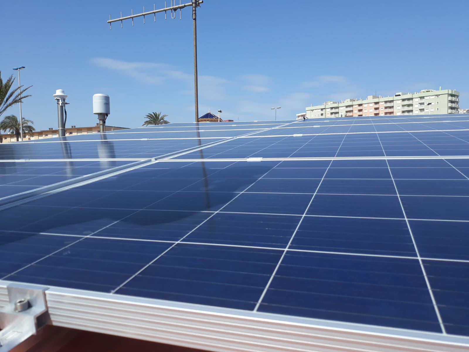 Imagen de las placas solares instaladas para alimentar los dos puntos de recarga de coches eléctricos habilitados en el aparcamiento.