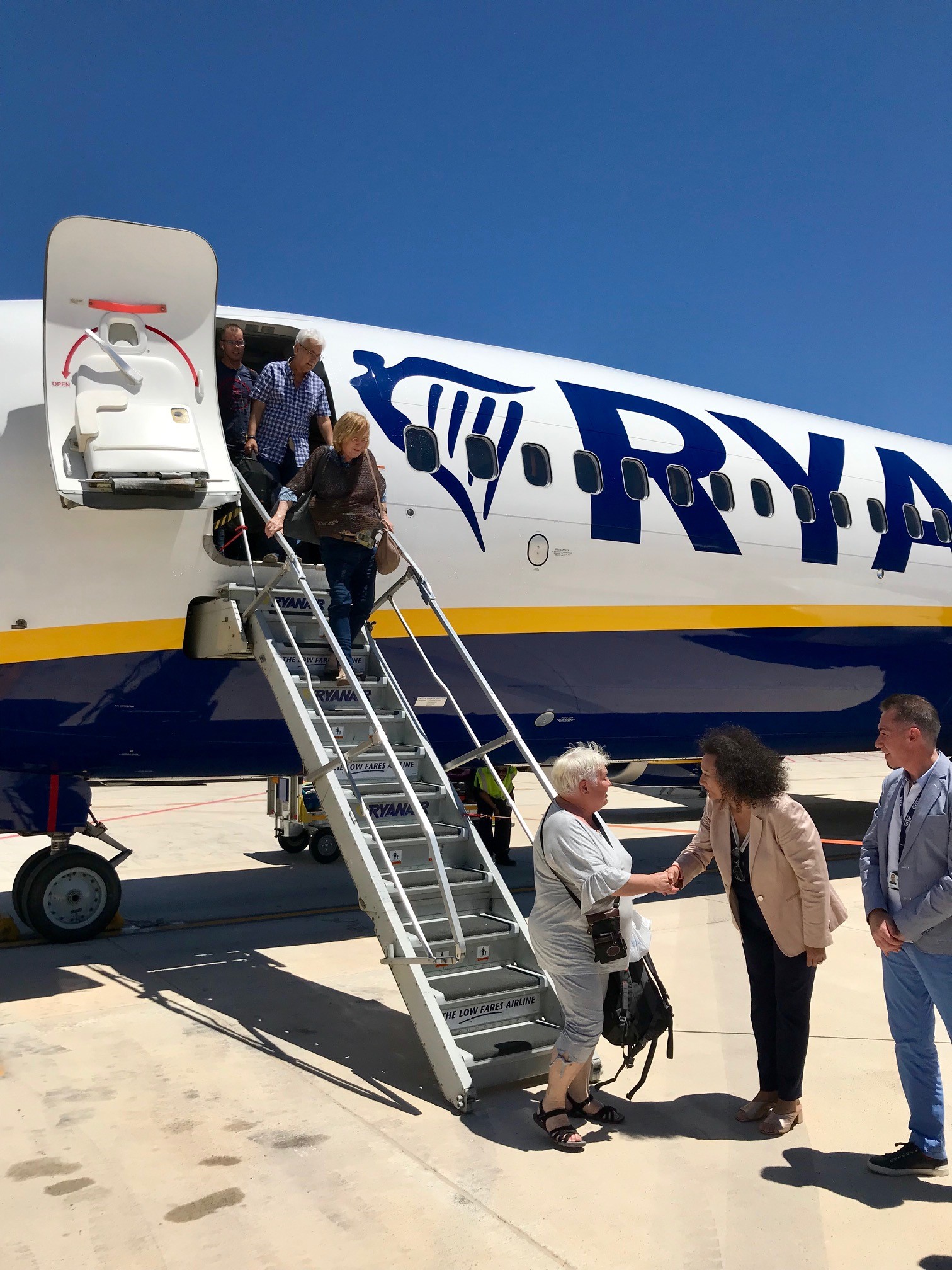 La secretaria general de la Consejería de Fomento e Infraestructuras, Yolanda Muñoz, saluda a los pasajeros de este nuevo trayecto aéreo.