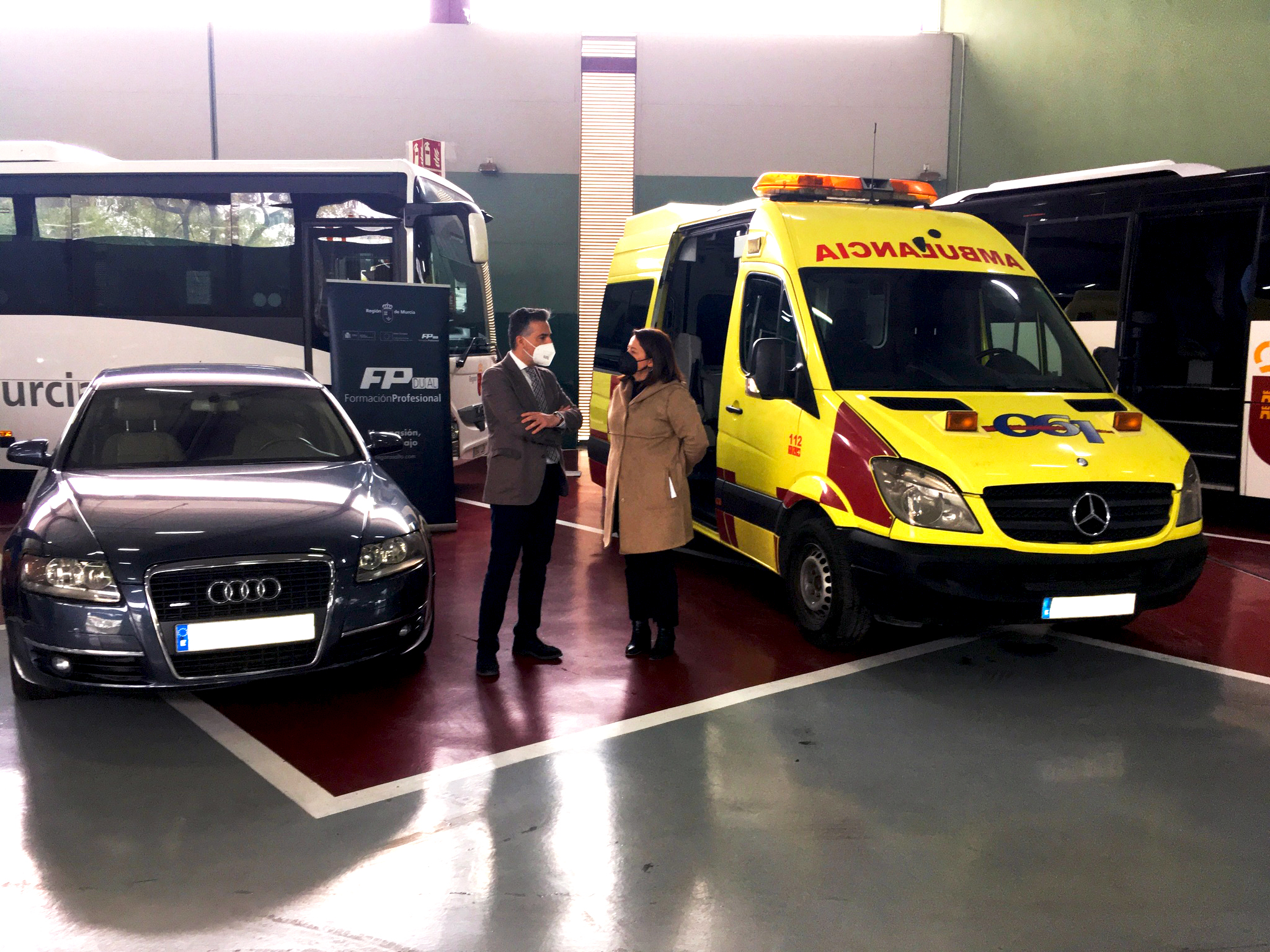 La directora general de Patrimonio, María Dolores Sánchez Alarcón, y el director general de Evaluación Educativa y Formación Profesional, Sergio López Barrancos, durante la entrega de vehículos del Parque Móvil Regional para destinarlos a prácticas de alumnos de FP.