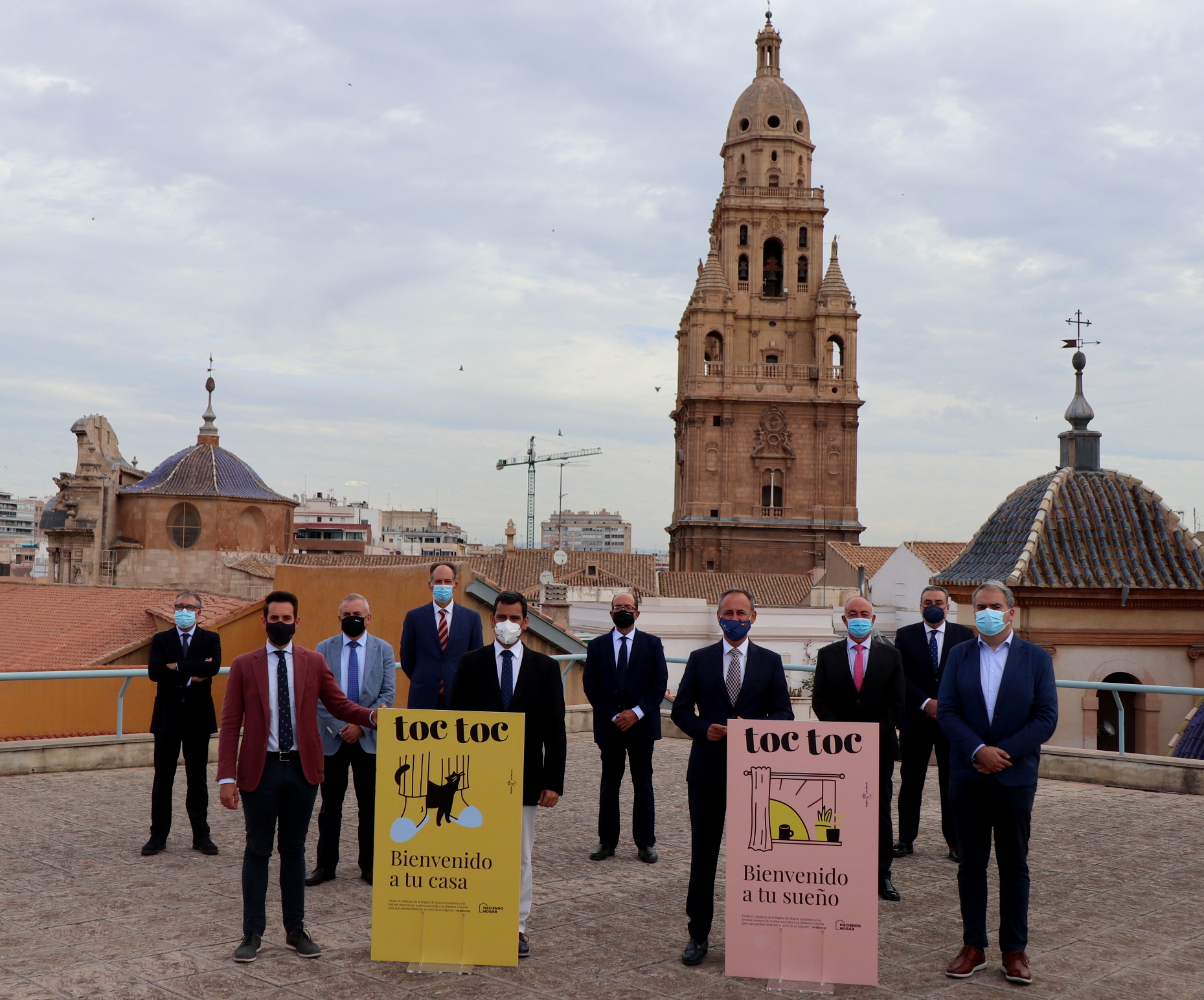 Los consejeros de Economía, Hacienda y Administración Digital, Javier Celdrán, y de Fomento e Infraestructuras, José Ramón Díez de Revenga, junto a los representantes de las entidades financieras que participan en la línea de avales de viviendas para jóvenes