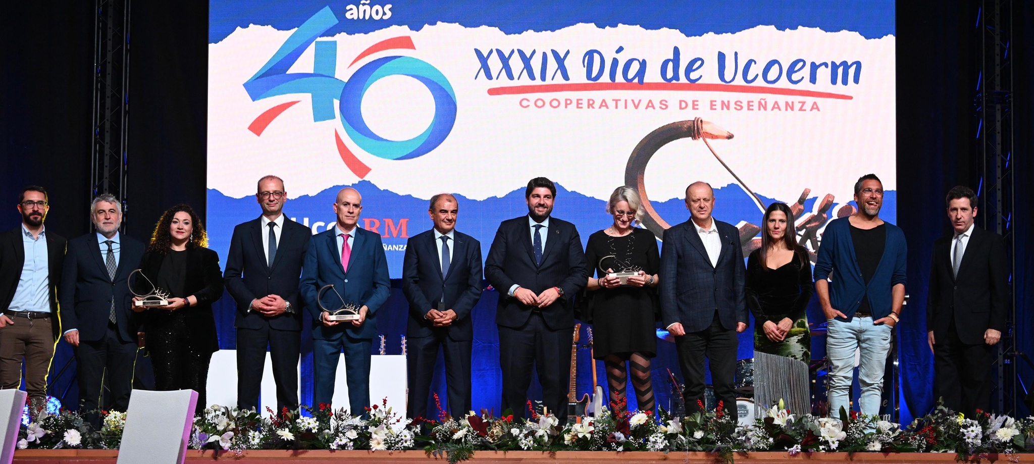 El jefe del Ejecutivo regional, Fernando López Miras, recogió anoche la Insignia de Oro y Brillantes de la Unión de Cooperativas de Enseñanza de la Región de Murcia (Ucoerm), “un reconocimiento para el Gobierno de la Región, que apuesta por la educación como uno de los pilares de la sociedad”, dijo el presidente.
