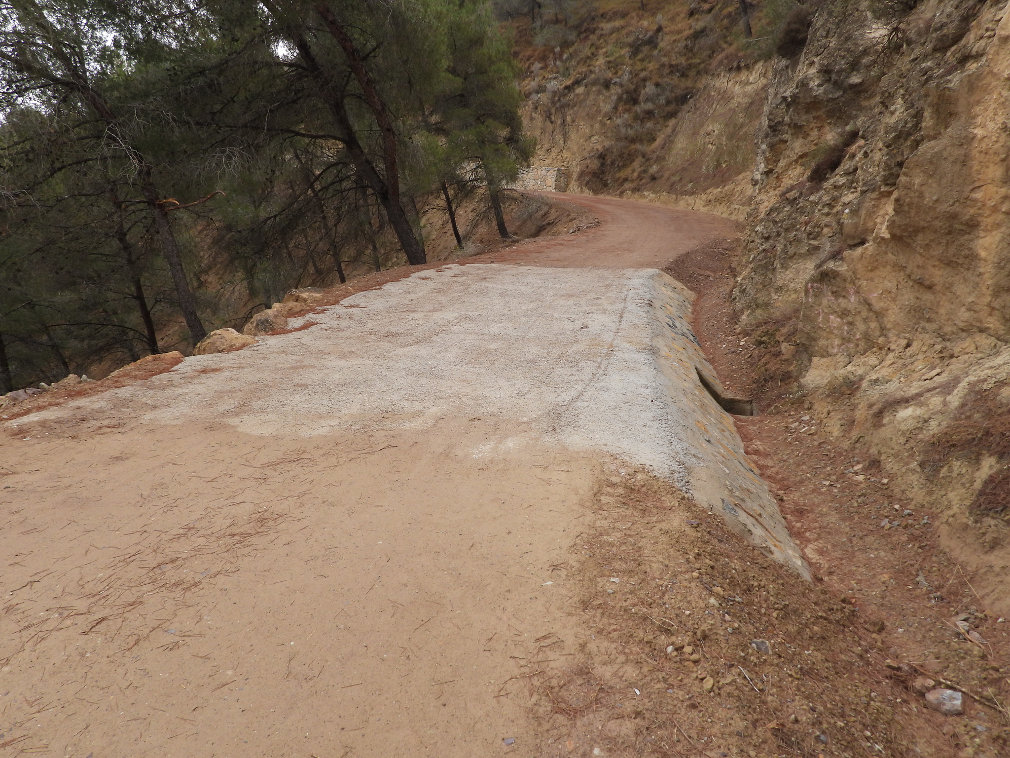 Contraste del camino forestal Los Puros en el Parque Regional El Valle y Carrascoy con el hormigón y la capa de arena con la que se ha cubierto el mismo