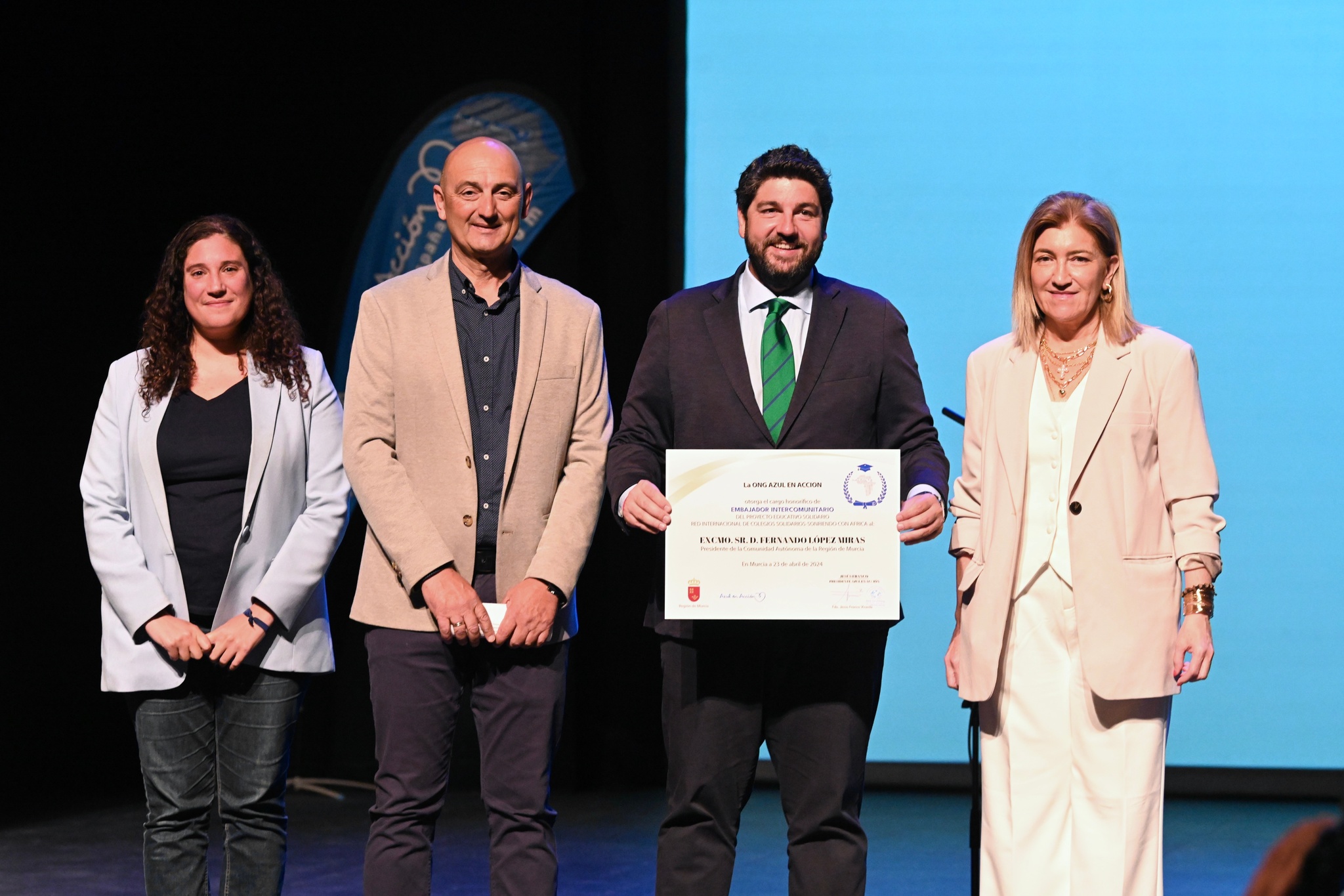 El presidente del Gobierno regional, Fernando López Miras, fue nombrado hoy embajador intercomunitario de la Red Internacional de Colegios Solidarios de la ONG para el desarrollo Azul en Acción, durante el acto de clausura del proyecto educativo ‘Sonriendo con África’ de dicha entidad. Esta iniciativa facilita material escolar y atención a alumnos de centros educativos de zonas rurales de Senegal.