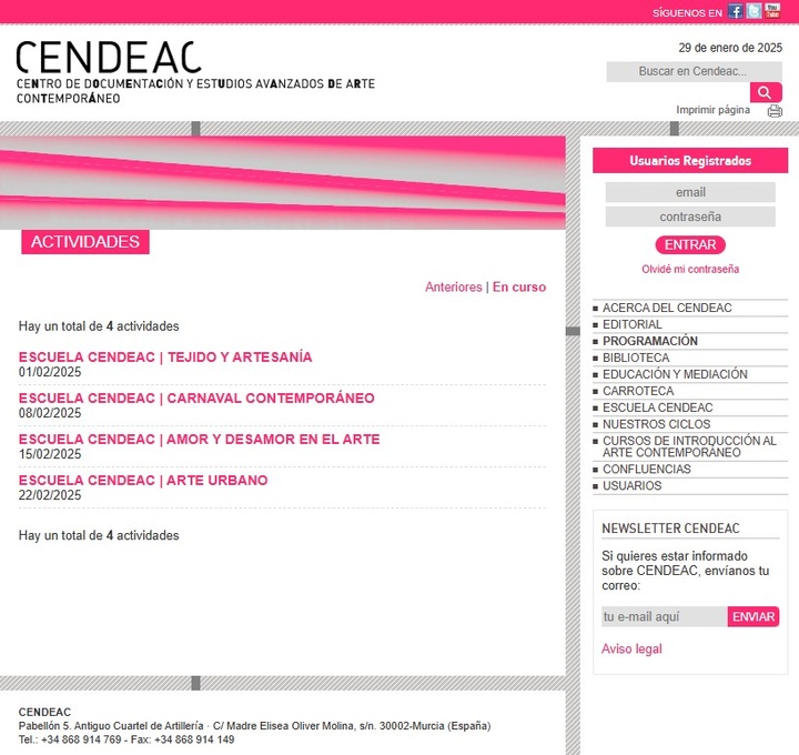 Para más información e inscripciones, se puede consultar el apartado de ‘Actividades’ del Centro de Documentación y Estudios Avanzados de Arte Contemporáneo (Cendeac)