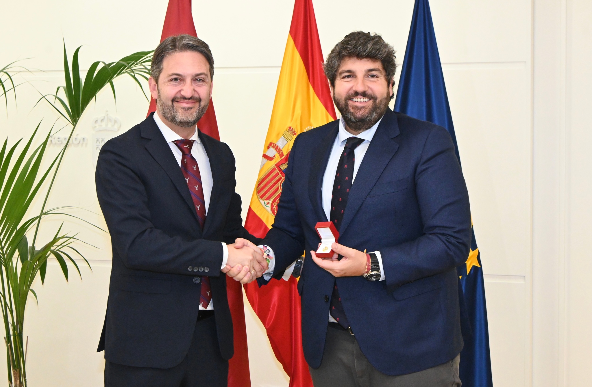 El presidente de la Comunidad, Fernando López Miras, recibió hoy en el Palacio de San Esteban al decano del Colegio de Ingenieros Técnicos Industriales de la Región de Murcia (Coitirm), Miguel Ángel Sola, coincidiendo con el 175º aniversario del reconocimiento de la profesión y de sus estudios reglados. Con motivo de esta conmemoración, el decano hizo entrega a López Miras de la insignia de oro del Colegio, en reconocimiento a su apoyo al desarrollo de la ingeniería y la industria en la Región.