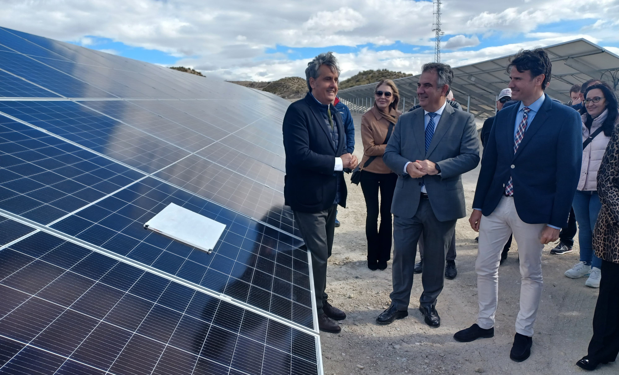 El consejero de Medio Ambiente, Universidades, Investigación y Mar Menor, Juan María Vázquez, durante el descubrimiento de la placa de una planta fotovoltaica de Anpier en Molina de Segura (2024).