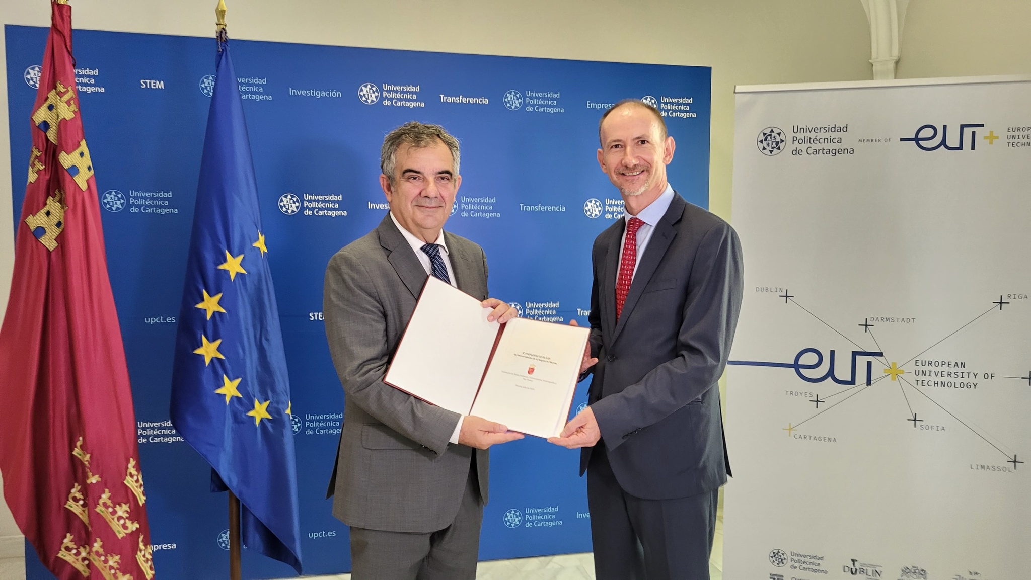 El consejero de Medio Ambiente, Universidades, Investigación y Mar Menor, Juan María Vázquez, entrega el Anteproyecto de Ley de Universidades de la Región de Murcia al rector de la Universidad Politécnica de Cartagena, Mathieu Kessler.