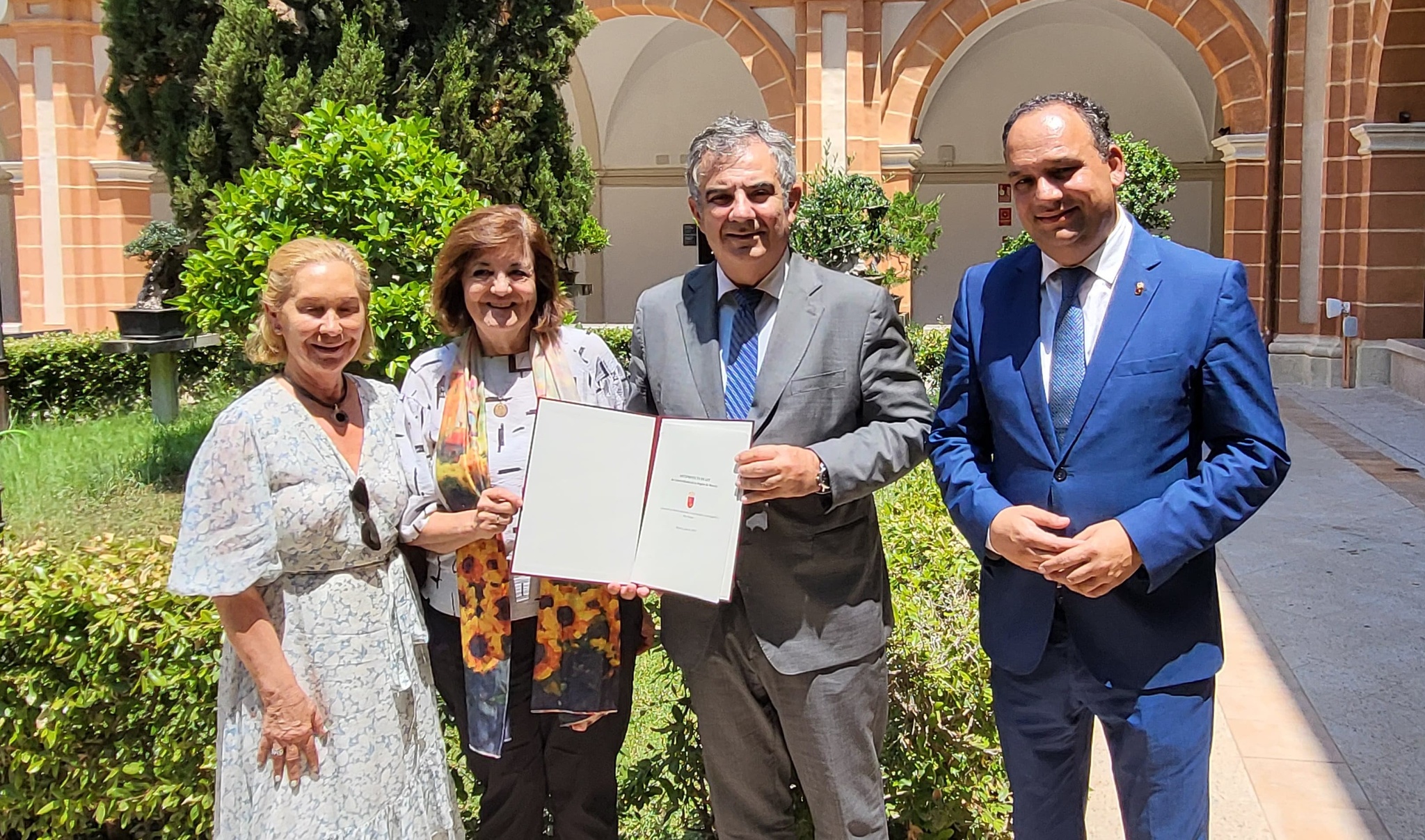 El consejero de Medio Ambiente, Universidades, Investigación y Mar Menor, Juan María Vázquez, entrega el Anteproyecto de Ley de Universidades de la Región de Murcia a la presidenta de la Universidad Católica San Antonio de Murcia (UCAM), María Dolores García, y a su rectora, Josefina García.