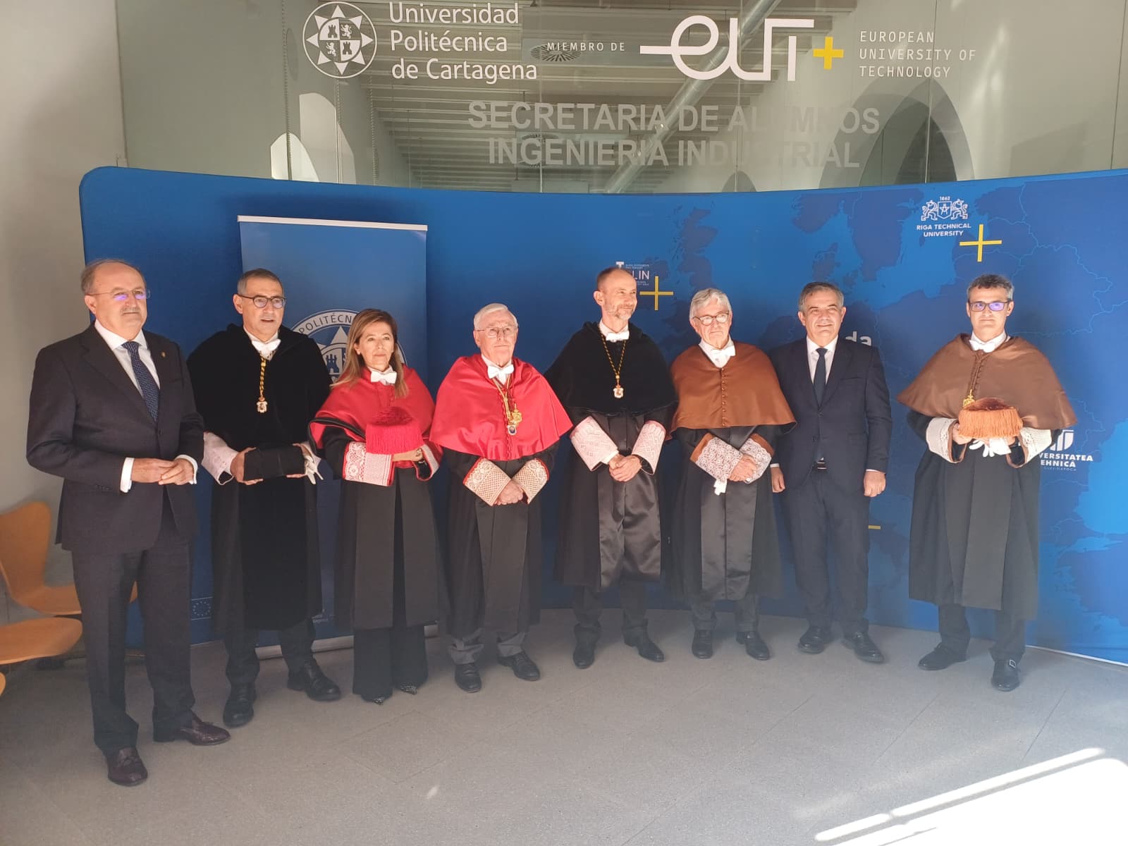 El consejero de Medio Ambiente, Universidades, Investigación y Mar Menor, Juan María Vázquez, junto al rector de la Universidad Politécnica de Cartagena, Mathieu Kessler, y el rector de la Universidad de Murcia, José Luján, antes del solemne acto de investidura como doctores honoris causa de José Antonio Cobacho y Joaquín Coello.
