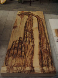 Medidas: 1,30 cm. x 0,51 cm.Técnicas: madera rebajada con fresadora, pirograbado, y soldado de estañoMateriales: madera, cola, esmalte, barniz y pintura