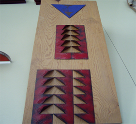 Autora: Anabel del Canto RodriguezMedidas: 100 cm. x 33 cm.Técnica: de Esmaltes opacos rebajados al ácido y doblado de piezasMateriales: madera, cobre, esmaltes.