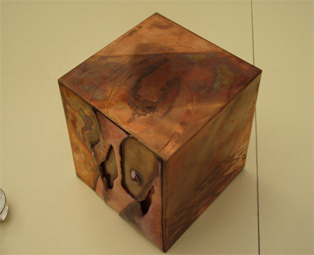 Autora: Anabel del Canto Rodríguez Medidas: 20 cm. x 20 cm. x 20 cm. Técnica: cobre forrando cubo, y dibujo rebajado al ácido, sobreposición de placas de cobre recortado, cincelado y esmaltadas con técnica de fundente base y transparentes. Materiales: cubo madera, placas de cobre y esmaltes.