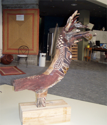 Autor: Manuel M. López Menárguez.Medidas: 1,36 cm. x 0,40 cm. x 0,67 cm.Técnica: talla de madera con incrustaciones y relieves, dorado al mixtión y teñido.Materiales: madera, cuero, piel, piedras, conchas, pasta, pan de oro y barnices.
